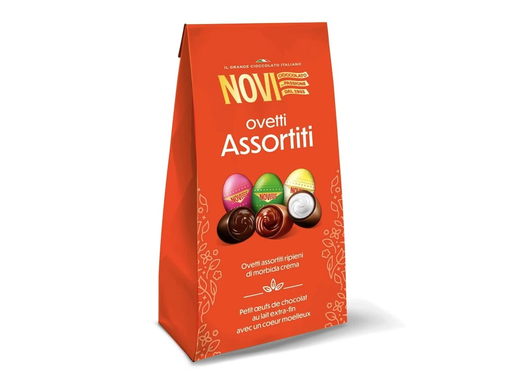Značka Novi je v Itálii synonymem pro „čokoládu s velkým Č“. Prémiovost této kolekce Ovetti Assortiti spočívá v nekompromisním přístupu k surovinám – základem je čisté kakaové máslo a výběrové kakao, bez levných náhražek a rostlinných tuků v čokoládě. Na rozdíl od běžných směsí, kde bývají náplně uniformní, Novi nabízí autentický chuťový kontrast mezi jemností lískových oříšků, sytostí hořké čokolády a mléčným pohlazením. Každé vajíčko je pečlivě zabaleno v lesklém barevném papíru, což podtrhuje luxusní charakter této limitované edice.